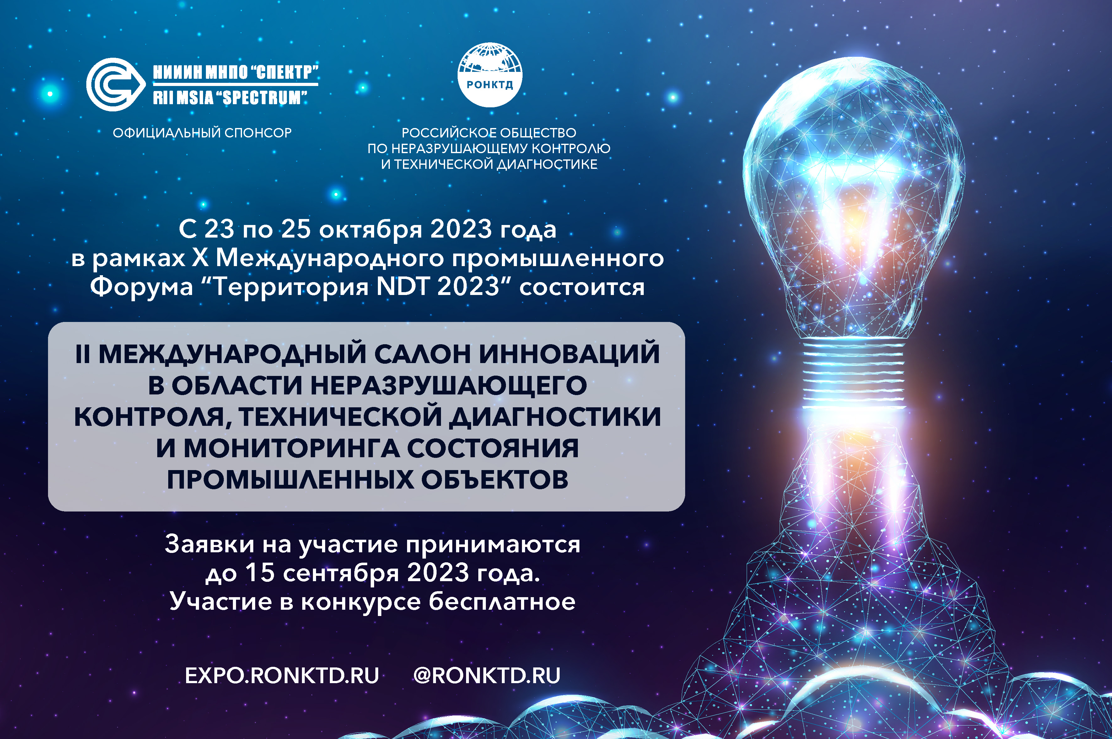 В рамках X Международного промышленного Форума "Территория NDT. Неразрушающий контроль. Испытания. Диагностика" и XXIII Всероссийской научной конференции НК и ТД будет организован 2-ой Международный салон инноваций в области неразрушающего контроля, технической диагностики и мониторинга состояния промышленных объектов (далее – Салон).